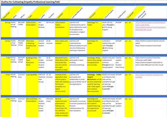 Every activity will be married to the time professional development is being held. The disclaimer will be that teachers and students will have to complete the exit ticket during or after the meeting. The way the Action Plan is designed and the new way instruction has to be delivered will be adjusted to fit all involved in the learning. The timeline is eventful because of the way our educational model is frequently begin redesigned, COVID, and this new model of virtual teaching.